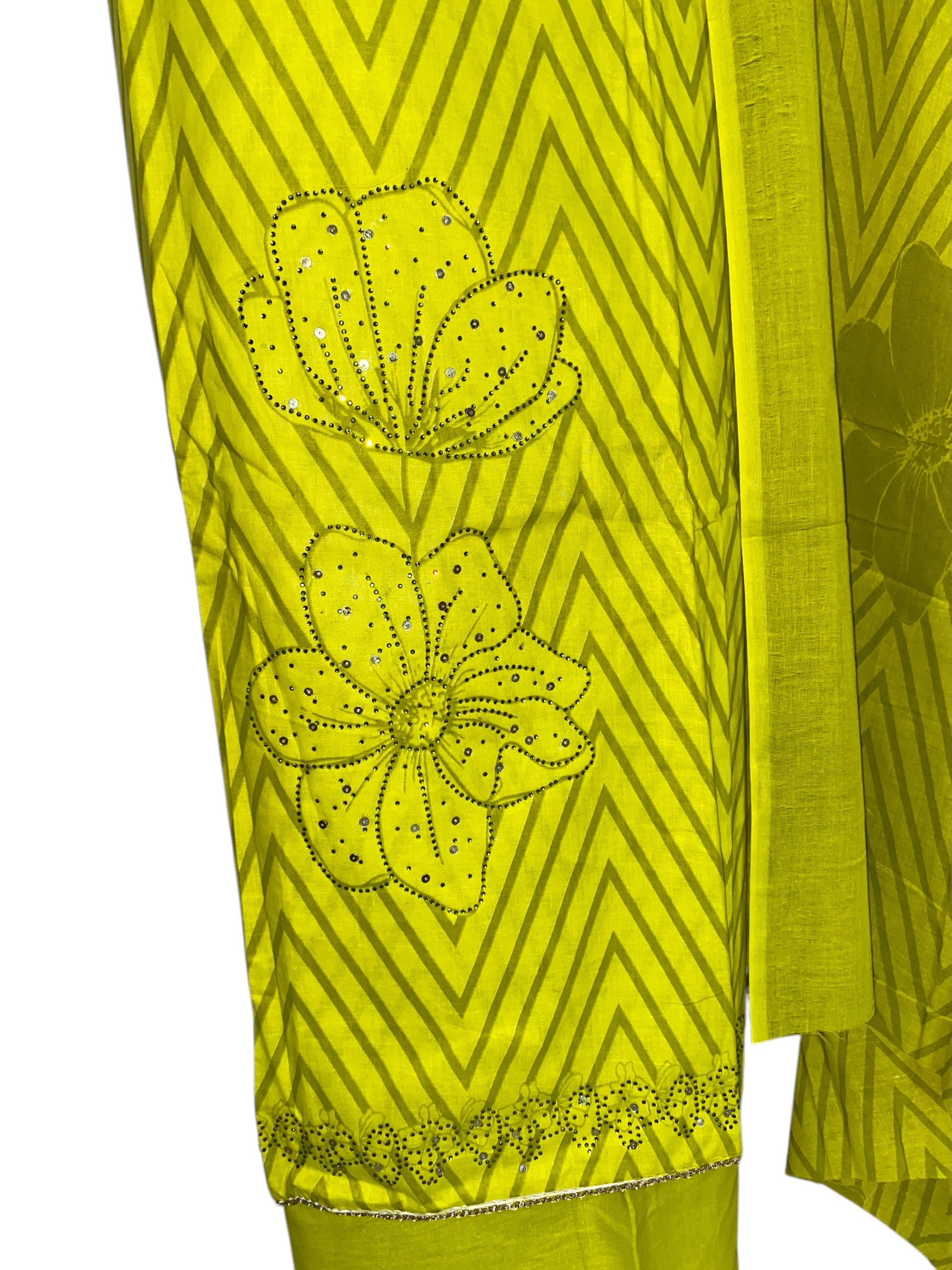 Stunning Mustard Green Pure Cotton Suit – 5m Unstitched Suit with Swarovski Highlights