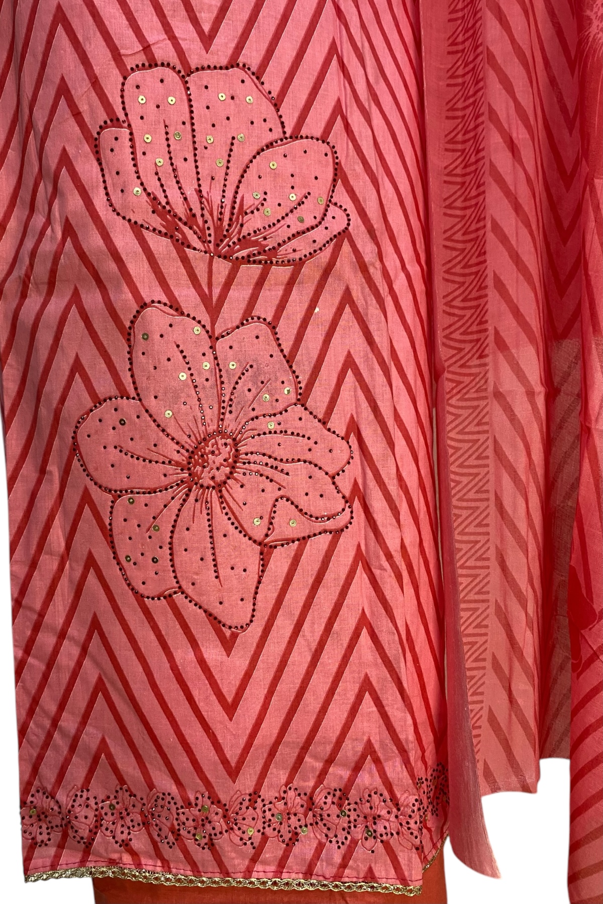 Stunning Pinkish Red Pure Cotton Suit – 5m Unstitched Suit with Swarovski Highlights