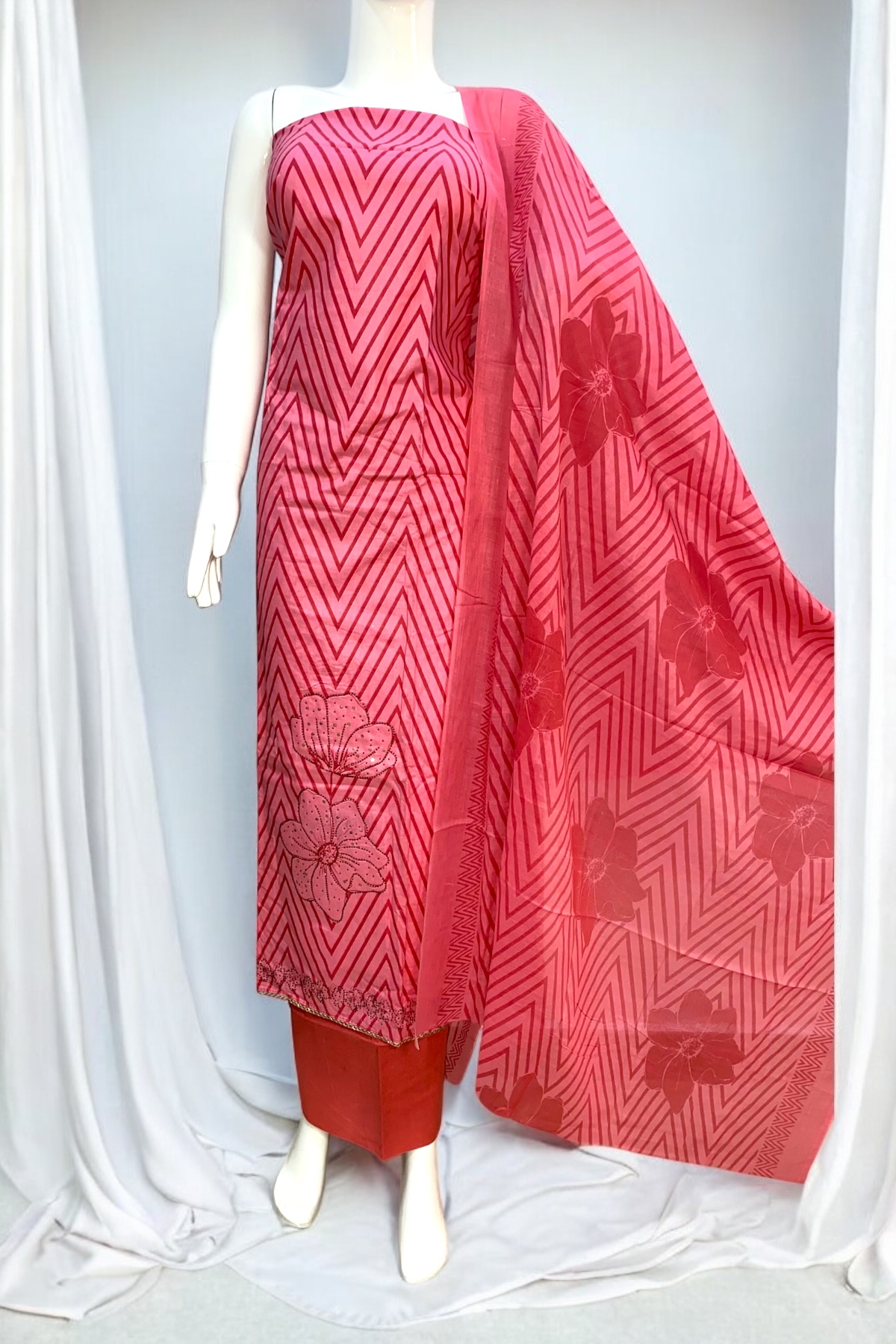 A premium unstitched pinkish red pure cotton suit with Swarovski highlights and a soft mulmul cotton dupatta. Perfect for casual outings, office wear, and daily elegance.